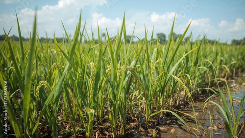© Sona, Obraz premium Lush green rice plants growing in a paddy field under a partly cloudy sky.
