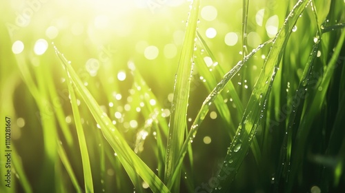 © GenZGraphics, Fototapeta premium Lush green rice plants thriving in sunlit fields with sparkling water droplets and vibrant bokeh background in springtime.