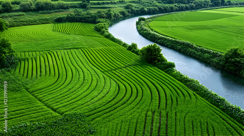 Obraz premium Lush green rice terraces alongside a meandering river; idyllic countryside landscape, perfect for travel brochures
