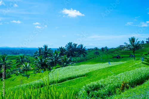© Neilstha Firman, Obraz premium Lush Green Rice Terraces Under Clear Blue Sky in Tropical Landscape