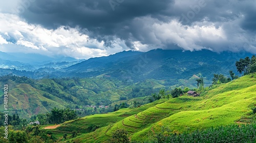 © euthan, Fototapeta premium Lush Green Rice Terraces Under Dramatic Cloudy Sky in Mountains