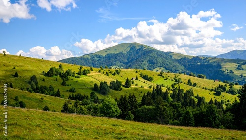© Farzan, Fototapeta premium Lush Green Rolling Hills and Forested Mountain Under a Vibrant Blue Summer Sky