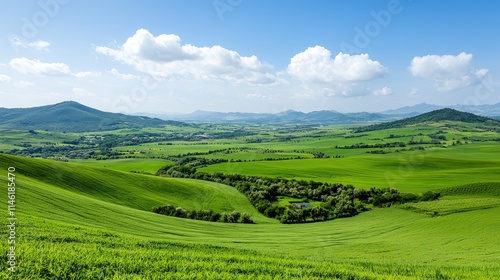 © kinara art design, Fototapeta premium Lush green rolling hills and valley landscape under a bright blue sky.