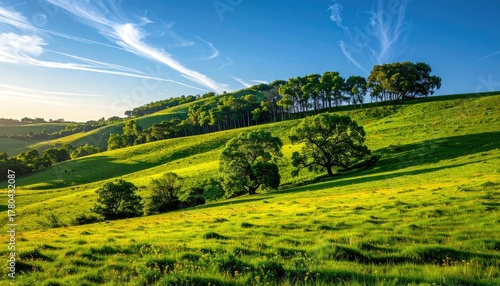 © ayana, Obraz premium Lush Green Rolling Hills Bathed in Golden Sunlight Under a Clear Blue Sky with Wispy Clouds