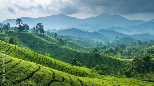 Fototapeta premium Lush green rolling hills create a captivating panoramic view, perfect for themes centered around nature and the environment. This scene offers ample photo style copy space.