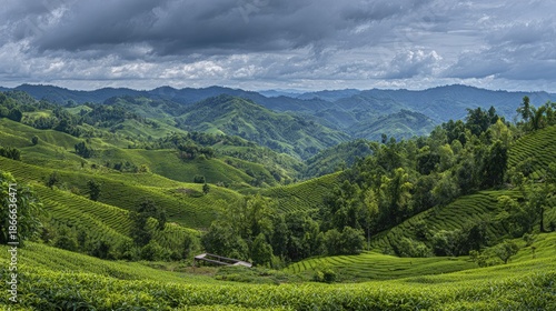 © Toto, Fototapeta premium Lush green rolling hills of a terraced plantation under a dramatic sky.