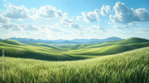 Fototapeta premium Lush Green Rolling Hills Under a Bright Blue Sky with Fluffy White Clouds in...