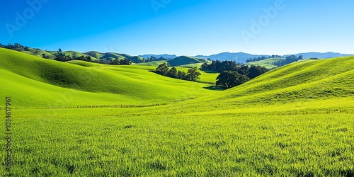 Fototapeta premium Lush green rolling hills under a clear blue sky.