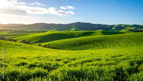 © cahaya, Fototapeta premium Lush green rolling hills under a partly cloudy sky