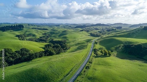 © euthan, Fototapeta premium Lush Green Rolling Hills with Serpentine Road in Bright Daylight