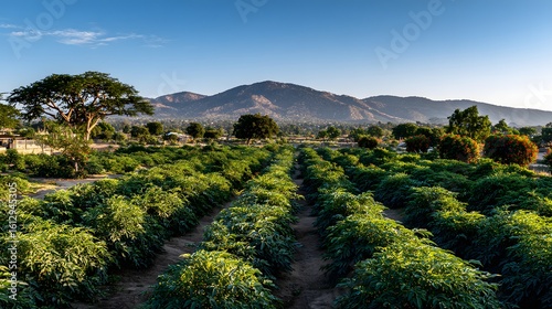 © suprato, Fototapeta premium Lush green rows of plants stretch across a rural landscape.