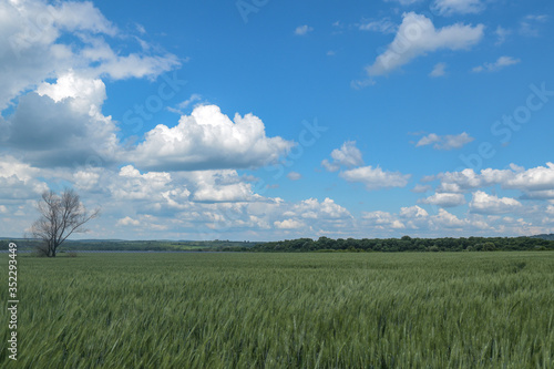 Fototapeta premium Lush green rural meadow with lonely dried tree, scattered clouds and solar...