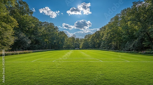 © Erisna Yolanda, Obraz premium Lush green soccer field nestled within a forest under a vibrant blue sky