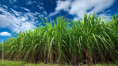 Obraz premium Lush green sugarcane stalks under a bright blue sky dotted with fluffy white...