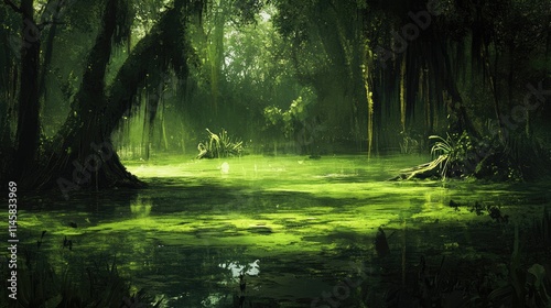 Obraz premium Lush green swamp scene with dense vegetation and reflective water surface in...