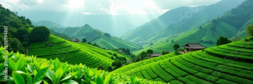 Fototapeta premium Lush green tea fields on rolling hills with traditional Chinese farmhouses,...