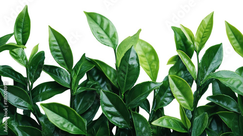 © Jawad, Obraz premium Lush green tea leaves basking in sunlight on a bright spring day in a serene garden setting