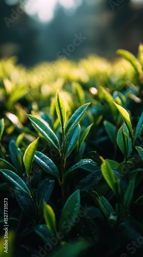 © SH Stock, Fototapeta premium Lush green tea leaves bathed in morning sunlight