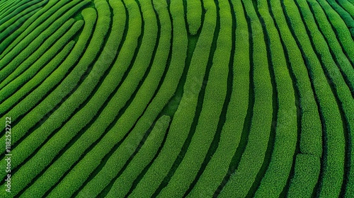 © Khalida, Fototapeta premium Lush green tea plantation glowing at sunrise creating a tranquil natureinspired backdrop