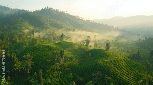 © AssanAI.Studio, Fototapeta premium Lush Green Tea Plantation Landscape at Sunrise in Misty Mountains