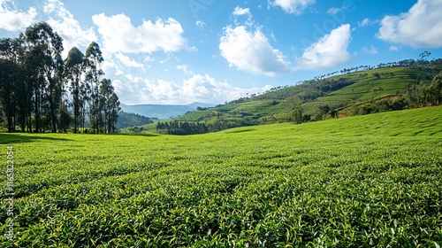 © Enggal Pitoyo, Fototapeta premium Lush green tea plantation on rolling hills under a bright sky.