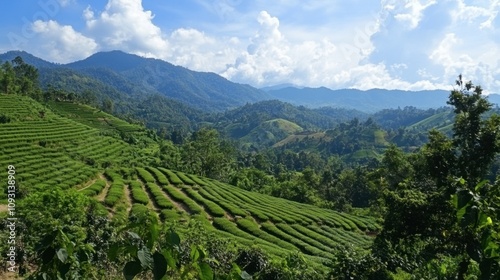 Fototapeta premium Lush Green Tea Plantations Amidst Rolling Hills and Scenic Mountains Under...