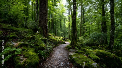 © Wildan, Fototapeta premium Lush green temperate forest scene features a winding footpath surrounded by moss covered rocks and tall trees