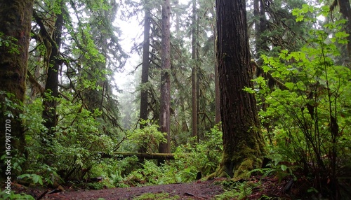© Fhang, Obraz premium Lush green temperate rainforest with tall trees and ferns.