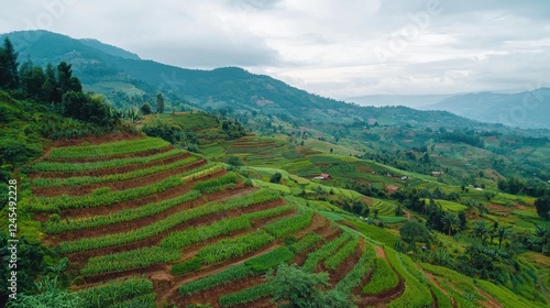 Fototapeta premium Lush Green Terraced Fields Under Cloudy Sky in Rural Landscape