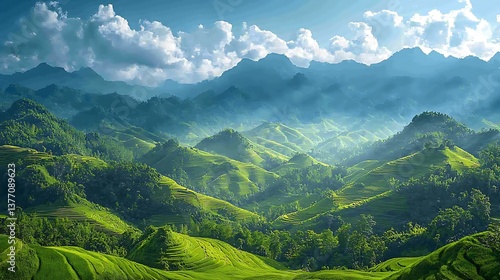 © Zhafran, Naklejka premium Lush green terraced rice fields and mountains under a vibrant sky.