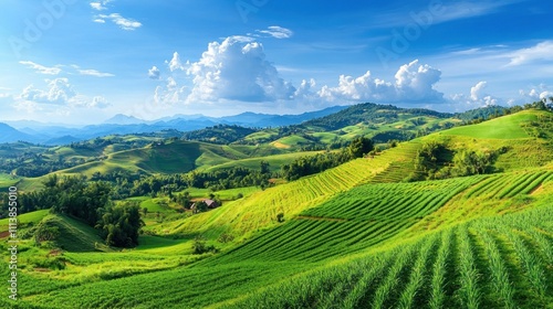 © isend, Fototapeta premium Lush Green Terraced Rice Fields Mountain Landscape