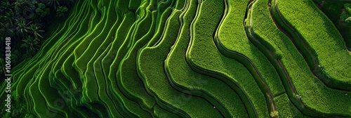© FAFO, Fototapeta premium Lush Green Terraced Rice Fields with Curve Layers Tropical Mountain farming - Panoramic Header Banner Background for Agriculture, Nature Landscapes, Eco-Tourism, and Rural Scenery