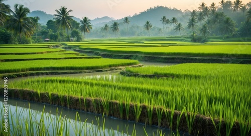 Obraz premium Lush green terraced rice fields with palm trees under soft morning light in a...