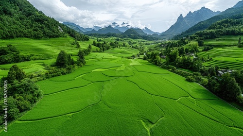 © tugkiara, Fototapeta premium Lush green terraced rice paddies in a valley, mountains in the background. Possible use Stock photo for travel, nature, agriculture, or tourism brochures