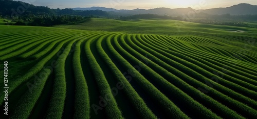 Fototapeta premium Lush green terraces of rice fields cascade down hillsides at sunrise