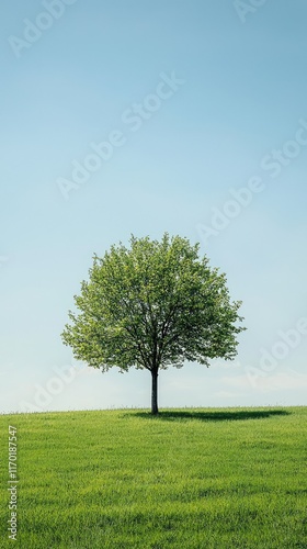 Obraz premium Lush Green Tree Against Clear Blue Sky on Vibrant Grass Field