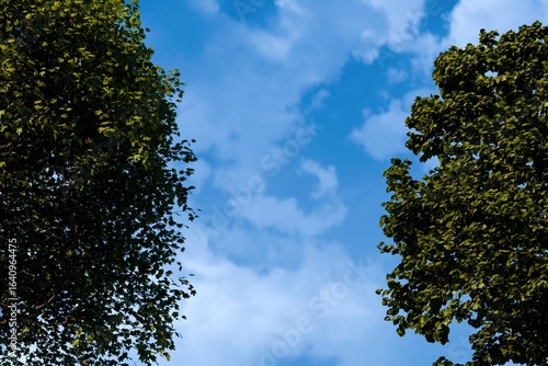 Obraz premium Lush green tree canopies frame a vibrant blue sky punctuated by fluffy white...