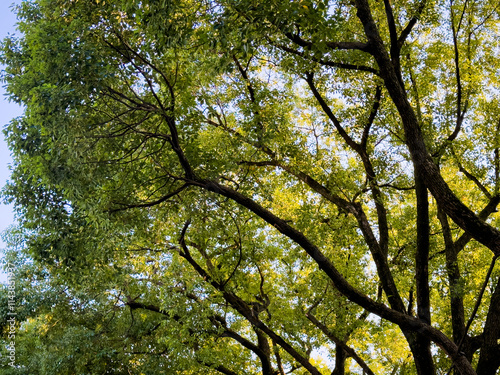 © evening_tao, Fototapeta premium Lush Green Tree Canopy Bathed in Warm Sunlight