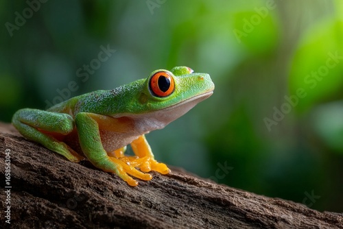 © aletia2011, Naklejka premium Lush Green Tree Frog with Bright Orange Eyes in Forest Setting