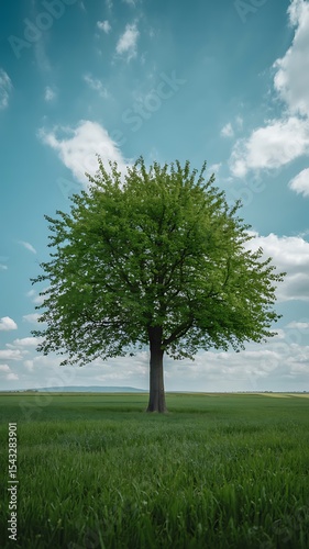 © AamirSohail, Obraz premium Lush Green Tree in Vibrant Spring Field: Nature Photography, Serene Landscape, Pastoral Scene
