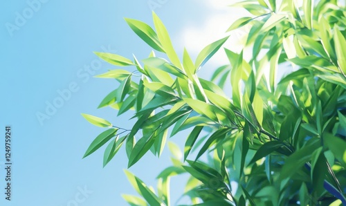 Naklejka premium Lush green tree leaves swaying in a gentle breeze, captured against a bright blue sky to create a serene and refreshing natural composition