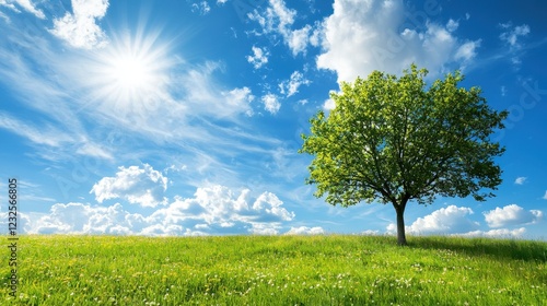 © Kitta Studio, Obraz premium Lush Green Tree on Vibrant Grassland Under a Bright Blue Sky