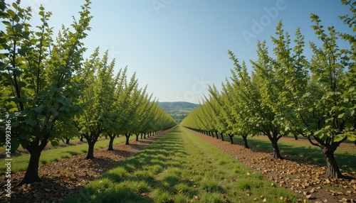 Naklejka premium Lush Green Tree Rows in a Scenic Orchard Landscape Under Clear Sky