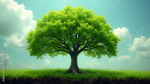 © Evgenii, Obraz premium Lush green tree standing alone on a grassy hill under a clear blue sky adorned with clouds during daylight