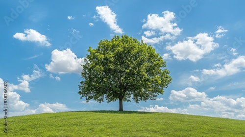 © Theeranan, Obraz premium Lush green tree standing tall on a hill, under a clear blue sky dotted with fluffy clouds.