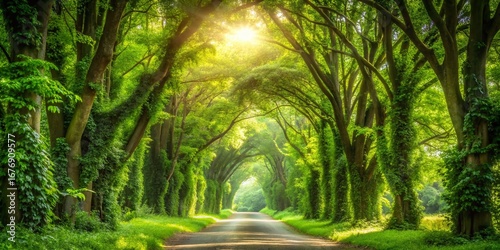 Naklejka premium Lush Green Tree Tunnel Path: Ecotourism, Wellness, and Lifestyle Stock Photo