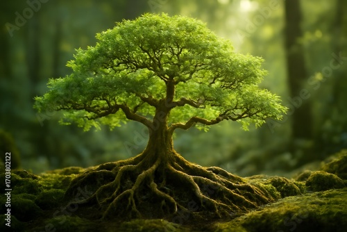Fototapeta premium Lush Green Tree with Roots in Serene Forest Setting Surrounded by Soft Light...