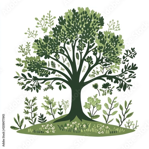 © LyceeChee, Obraz premium Lush Green Tree with Varied Foliage and Flowers