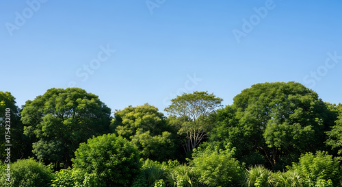 © Arfin, Fototapeta premium Lush Green Trees Against a Clear Blue Sky Nature s Beauty and Serenity