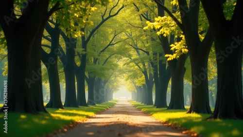 © Seyyar, Naklejka premium Lush green trees in a sunlit park pathway